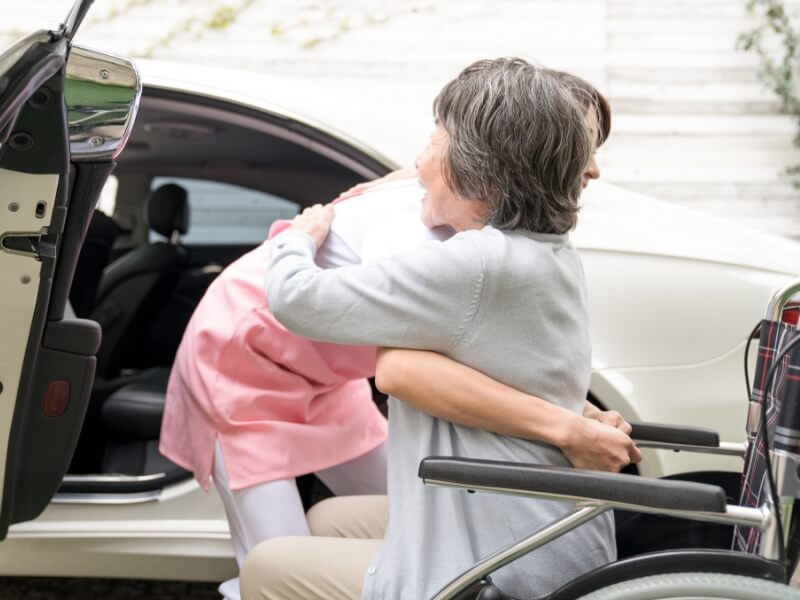 乗降補助とは、当社がご用意する車で要介護者の通院をサポートする際、車への乗降に介護保険を利用するものです。ただし、乗車中の「運賃」は介護保険の対象ではなく、別途のご請求となります。あらかじめご了承ください。